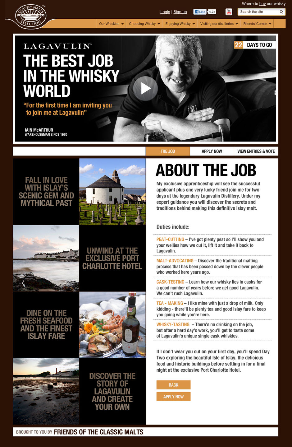We invited known whisky enthusiasts via email to apply for the exclusive opportunity to become Iain McArthur’s first ever apprentice at the Lagavulin Distillery on the Isle of Islay. Iain is a bit of a legend in the whisky world so we used him to rally the troops and get people excited about joining him in a series of revealing videos. The campaign was a success with over 10,000 fans applying for the job and we got over 20,000 new Friends.